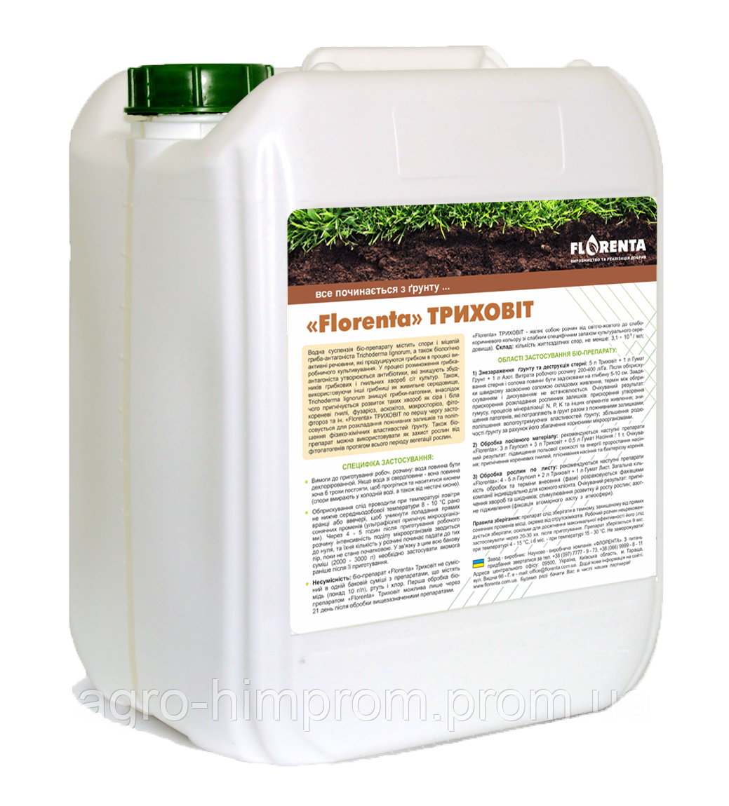 ТРІХОФІТ- це біо-препарат, що застосовується для розкладання пожнивних решток, поліпшення фізико-хімічних властивостей грунту. Водна суспензія препарату містить спори і міцелій гриба-антагоніста Trichoderma lignorum, а також біологічно активні речовини, які продукуються грибком в процесі виробничого культивування. В процесі розмноження грибка-антагоніста продукуються антибіотики, які знищують збудників грибкових і гнильних хвороб с/г культур. Також, використовуючи інші грибниці як живильне середовище, Trichoderma lignorum знищує грибки-патогени, внаслідок чого пригнічується розвиток таких хвороб як кореневі гнилі, сірі і біла, фузаріоз, аскохітоз, макроспоріоз, фітофтороз та ін Препарат можна використовувати як захист рослин від фітопатогенів протягом всього періоду вегетації рослин.